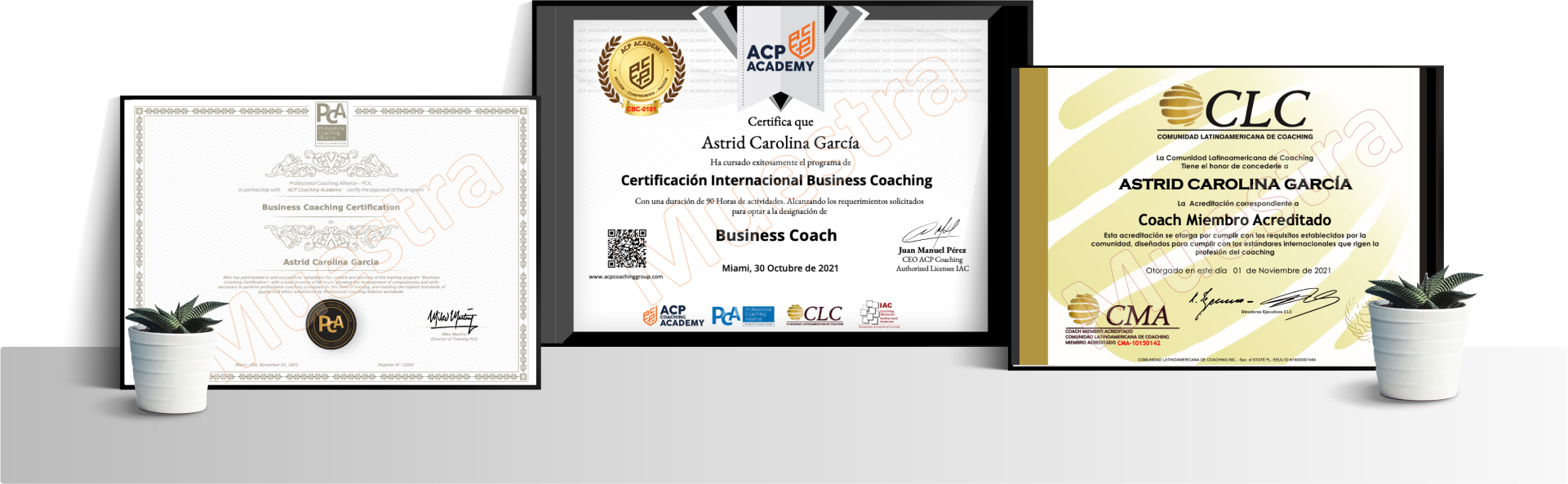 ➡ Certificado Internacional que te acredita como Business Coach emitido por ACP Coaching Academy bajo la Licencia IAC Coaching Masteries de la International Association of Coaching. |